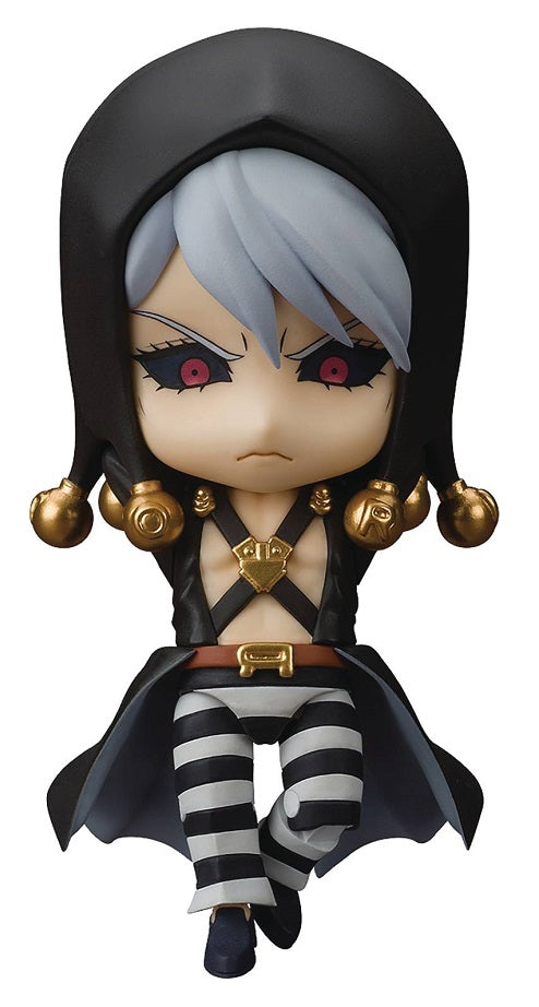From Medicos. From the anime series JoJo's Bizarre Adventure: Golden Wind comes a Nendoroid of the calm and composed assassin team leader Risotto Nero. The figure is fully articulated so you can display him in a wide variety of poses. He comes with three face plates including an assassin-like standard expression as though waiting for the perfect time to attack, a bloodcurdling combat expression and an expression of him looking down on his opponent, perfect for recreating the scene where he shows off his memorable pose. Optional parts include effect parts to recreate attacks from his Stand along with various different interchangeable hand and arm parts.